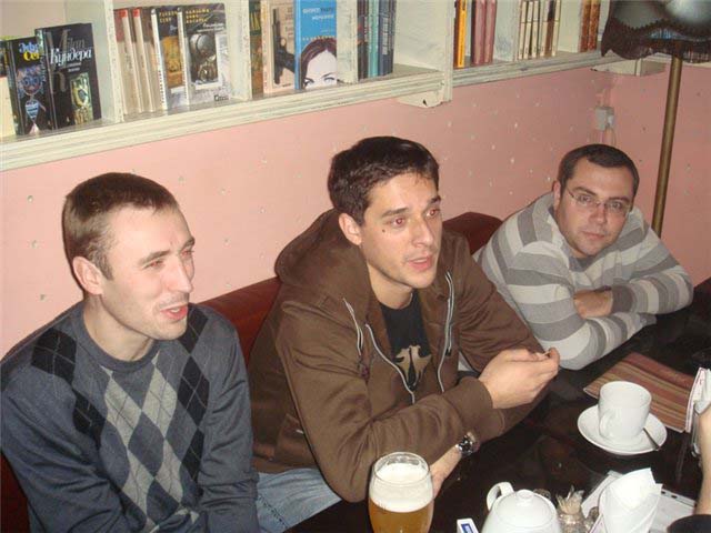 Вчерашняя встреча пролетело довольно быстро, несмотря на то, что мы вроде и посидели 3 часика. Пока народ собирался, а было 10 человек всего (может если бы не середина недели было бы больше?), мы обсудили некоторые интересующие нас моменты, в частности просмотр гонки чемпионов в кафе. В это время Массег бегал по кафе в поисках пива, и в итоге пришел к нашему столику с наполовину пустым (или полным) бокалом пива А потом рассказывал, что в "Победе" очень веселящий чай с бергамотом. В это время опаздывающие потихоньку подтягивались и мы вспомнили борьбу в чемпионате-2008. А Оля видимо так и не пошла на курсы по френчу, потому что была с нами уже в 20:30. |